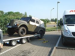Der Trailer mit dem GAZ 69 sah auf den ersten Blick schon etwas 'legere' aus, zumindest was die Verzurrung betraf. Ein Gurt um die Vorderachse und ein Gurt um die Hinterachse. Reicht völlig aus, hat sich einer der Old-Timerfreun.de gedacht. Ein anderer hatte diese Leichtigkeit mehr kritisch betrachtet. Aber Mann kann ja nicht immer alles besser wissen ... schon des dicken Halses wegen.
